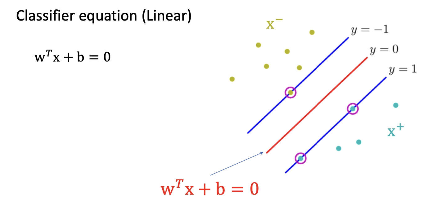 그리고 support vector 에 대해서는 음의 샘플이면 -1, 양의 샘플이면 1이 되도록 한다고 해보자.