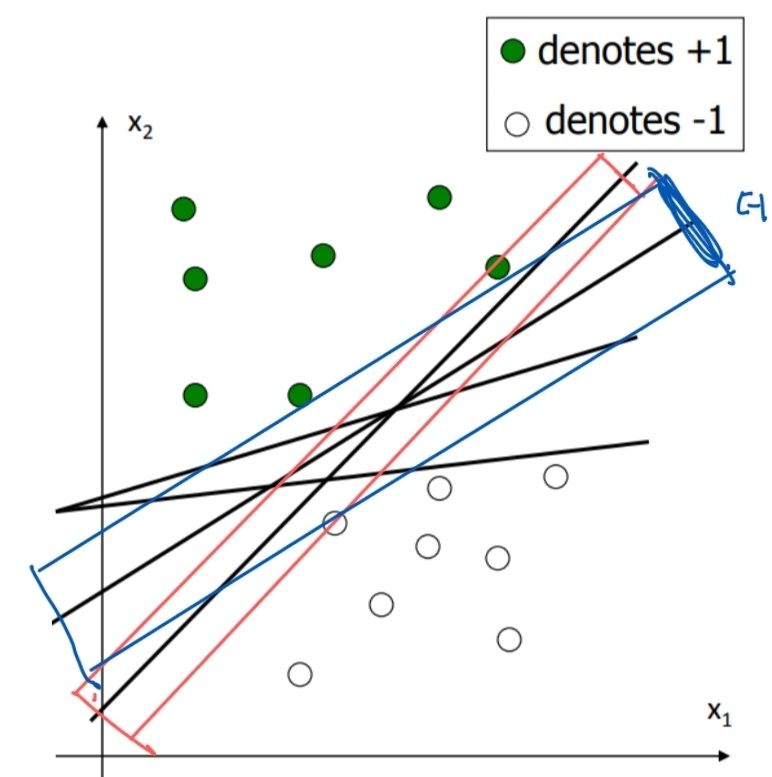 그림으로는 margin이 제일 크게 나오는 직선을 찾는 것이 더 좋을 것 같다.