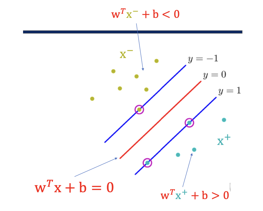 그리고 이 문제의 목표는 음의 샘플들을 이 직선에 넣었을 때는 Wᵀx + b < 0 이 되고,