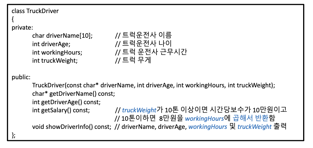 void showDriverInfo() const; // driverName, driverAge, workingHours 및 payPerHour 출력