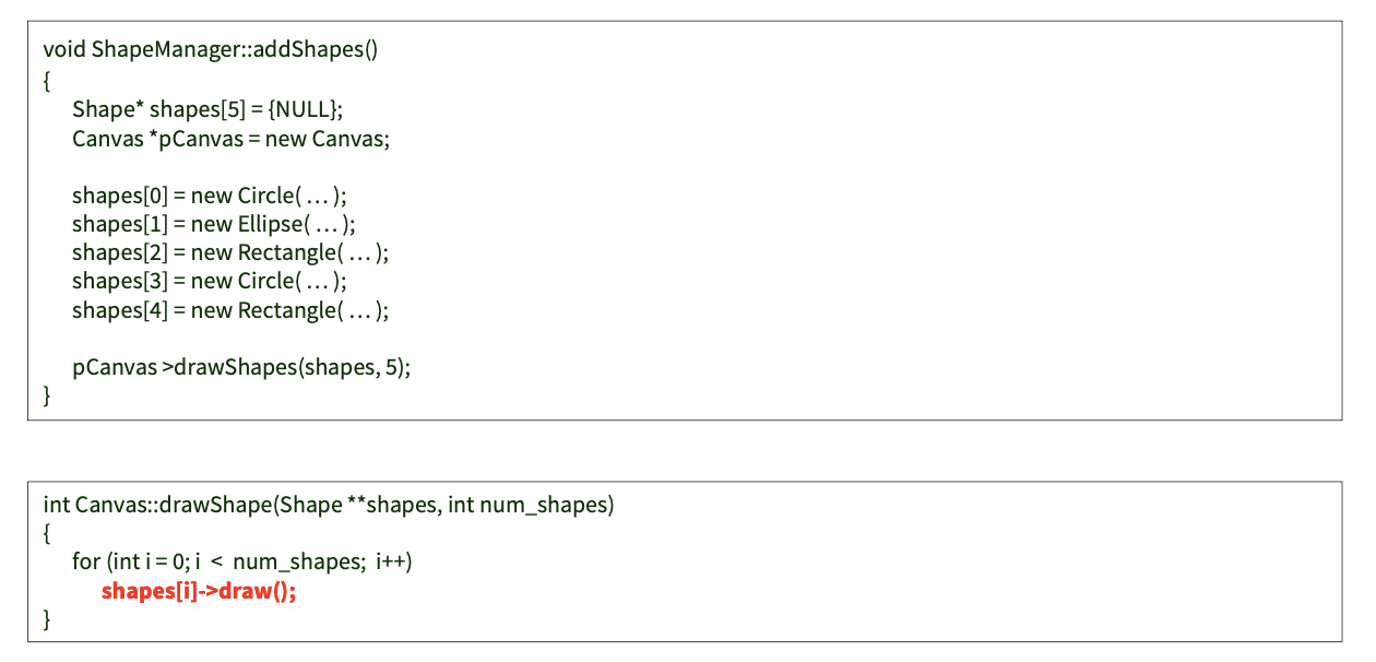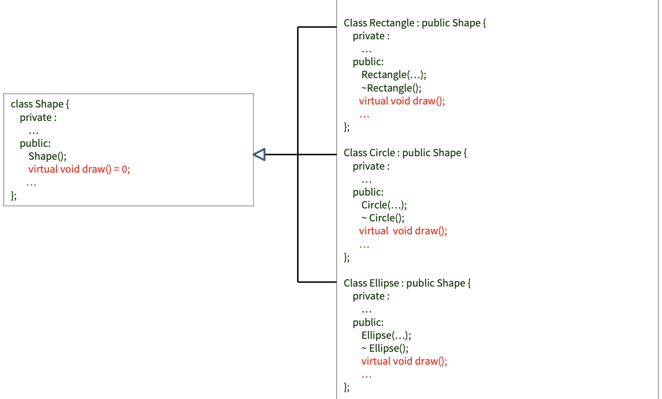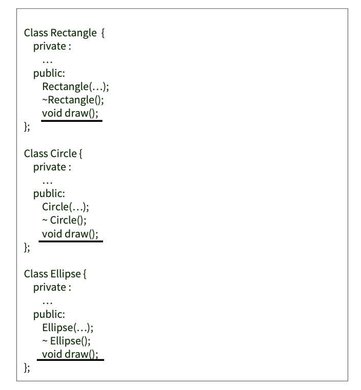 이를 기반으로 Shape 라는 인터페이스를 정의하고, 공통 메서드인 draw() 를 순수 가상함수로 만들어 인터페이스에 정의한 뒤, 각 subclass가 구현하도록 만든다.