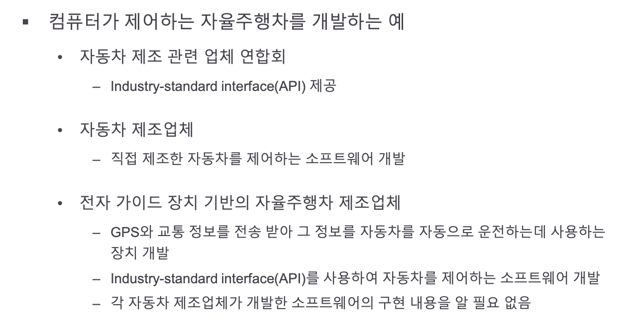 이때 각 자동차에서 보내는 자신의 위치 정보를 기반으로 자동차 이동 경로를 제어하는 소프트웨어를 개발하려고 할 때, 우리는 자동차들의 세부적인 구현을 알 필요 없이, 인터페이스 기능을 활용하여 자동차 이동 경로 제어 소프트웨어를 개발할 수 있다.