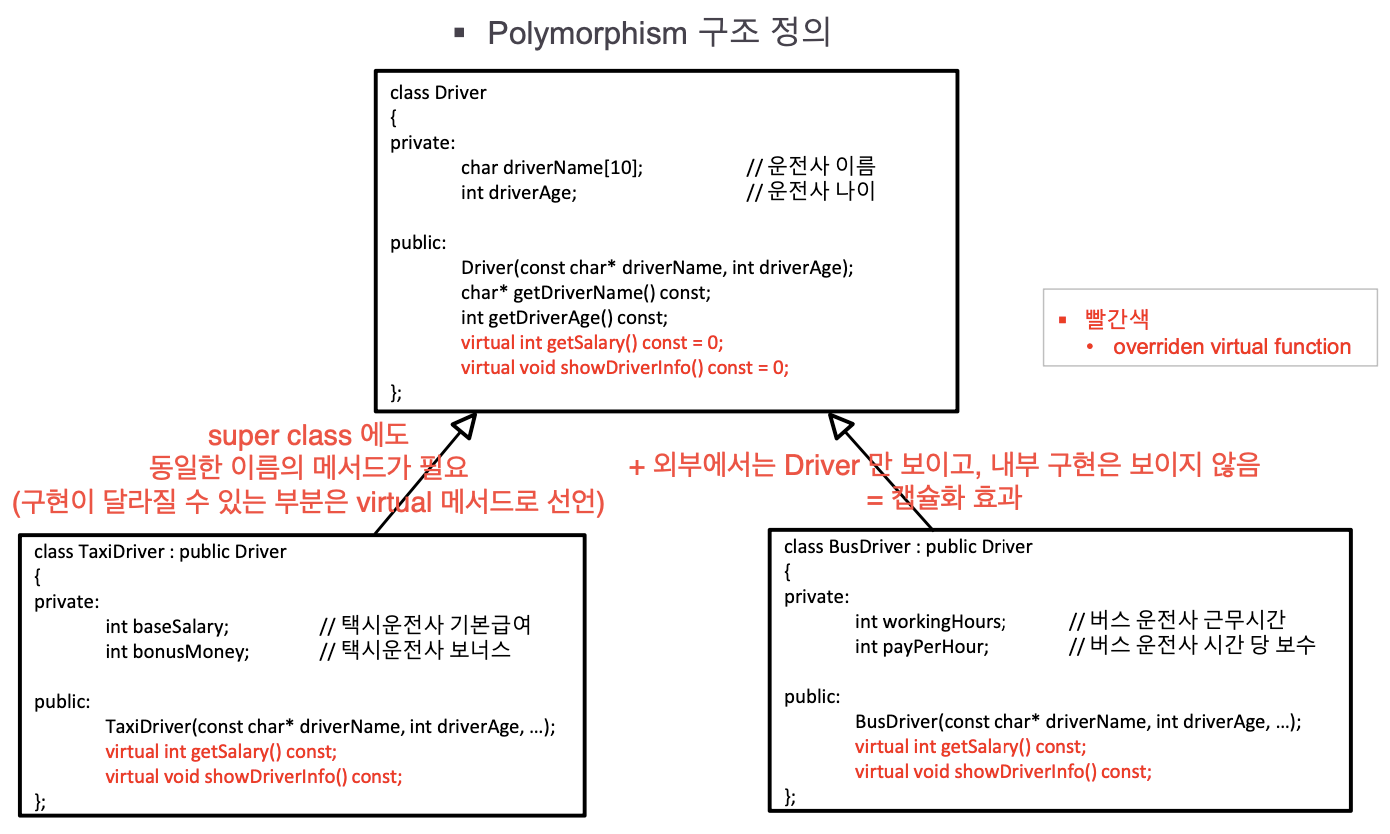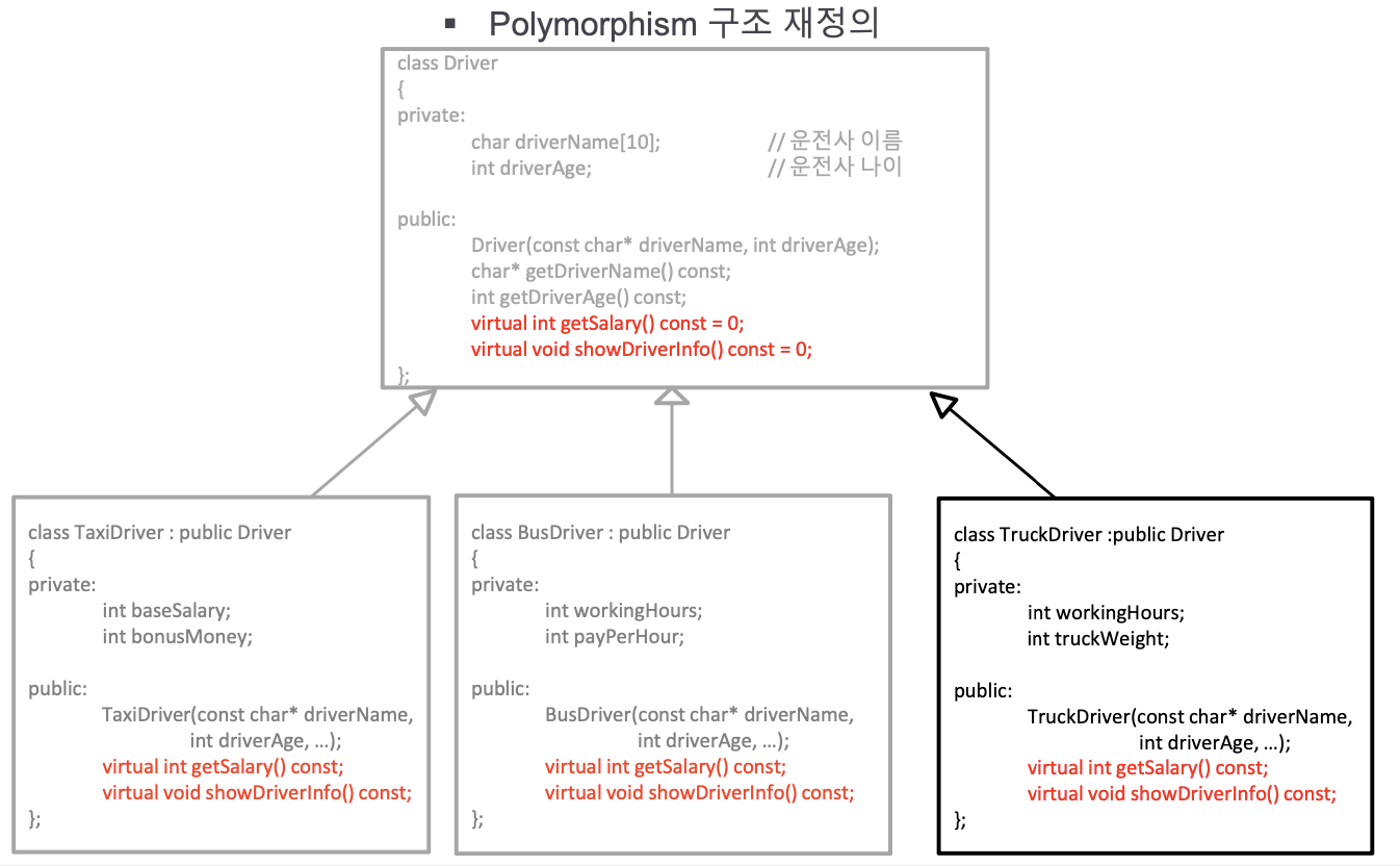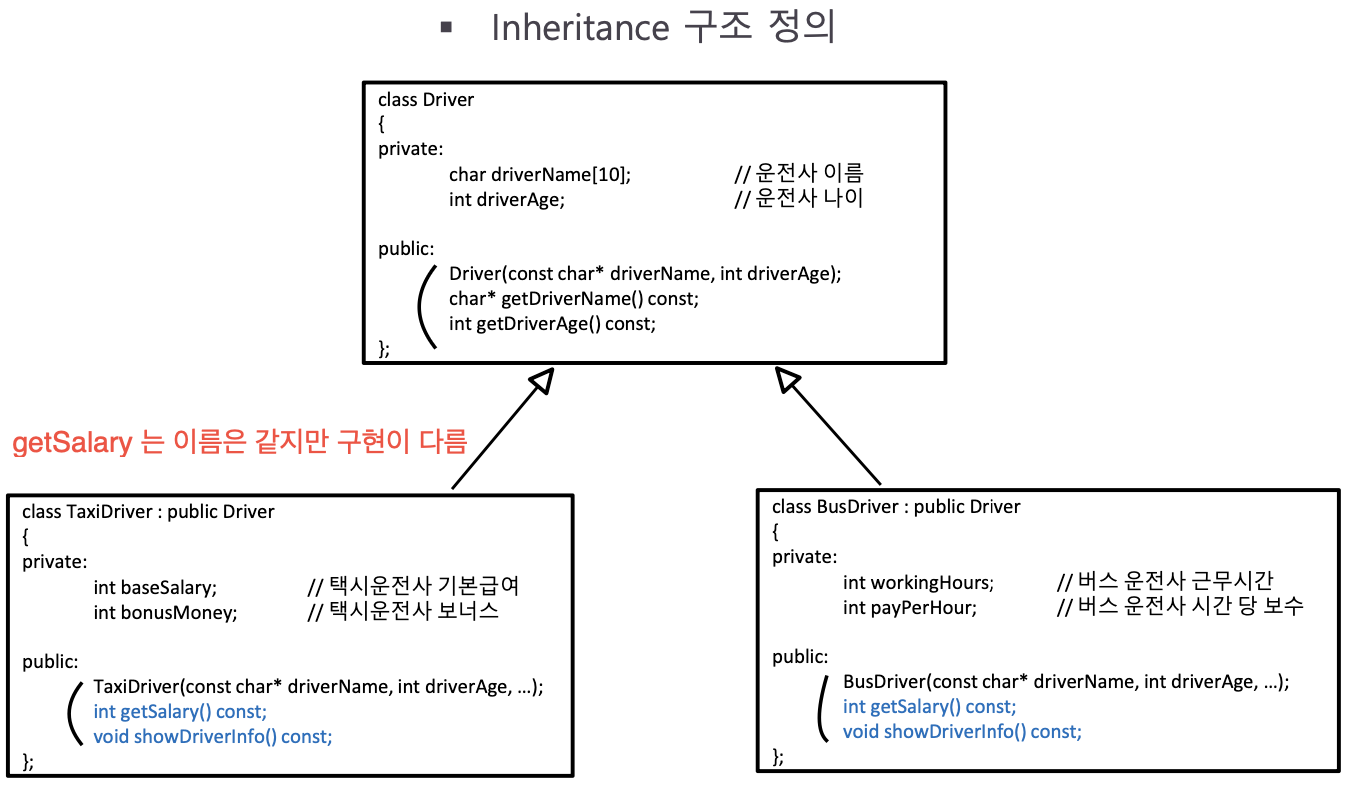 그리고 TaxiDriver, BusDriver 는 getSalary, showDriverInfo 함수를 오버라이딩하여 자체적으로 구현한다.