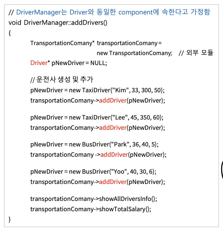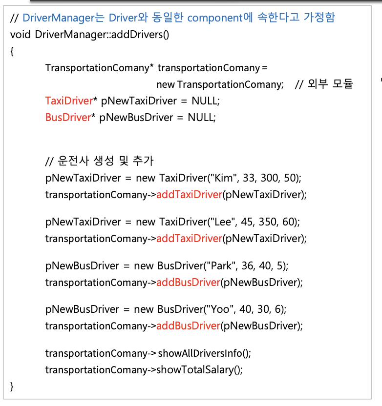 만약 TransportationCompany 클래스를 개발하는 팀과 Driver 를 개발하는 팀이 서로 다른 팀이라고 해보자.