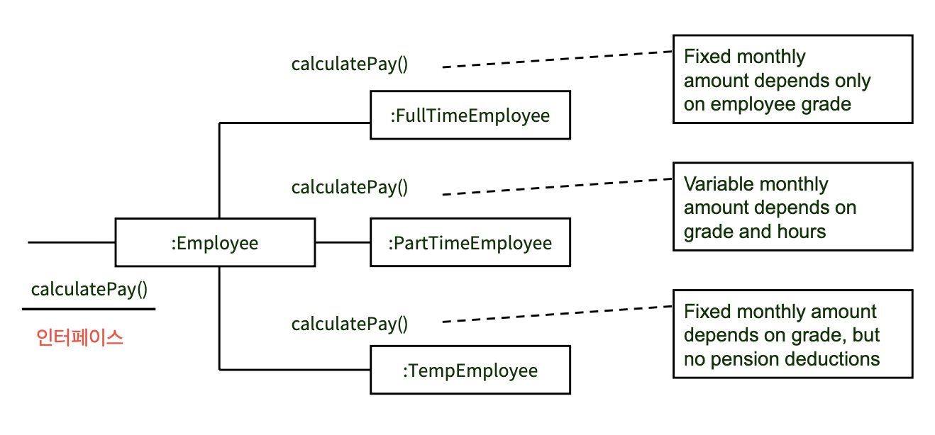 이 3가지 클래스의 구현은 모두 서로 다르겠지만 Employee 라는 인터페이스 정의에 맞춰서 개발하였기 때문에 외부 모듈에서는 Employee 인터페이스만 가져다가 calculatePay() 를 호출하면 세부 구현을 알지 못해도 급여를 계산할 수 있다.