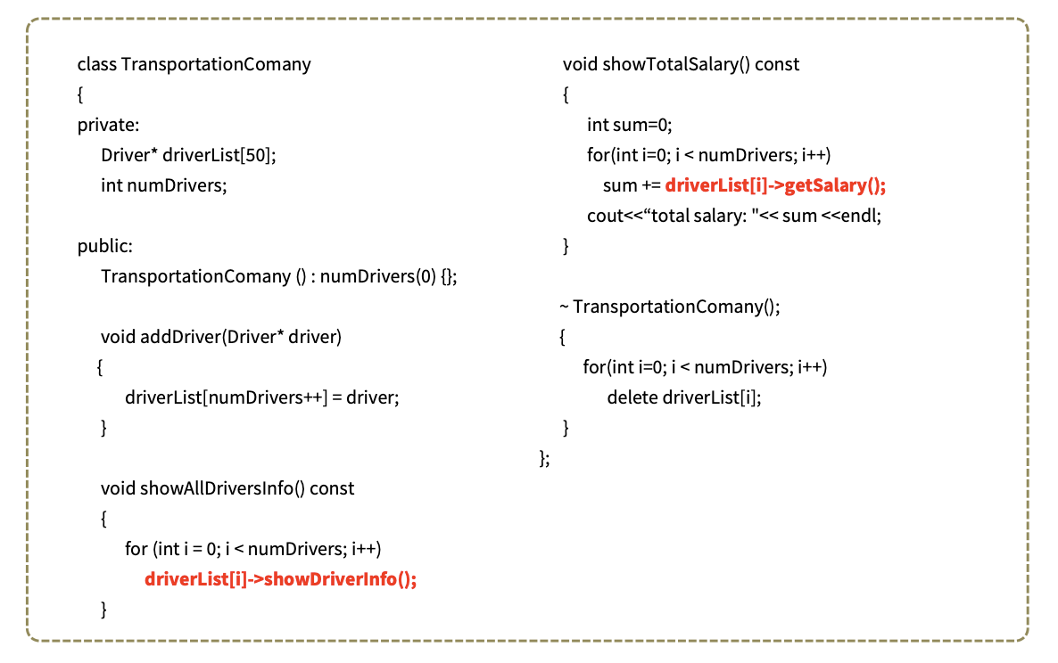 그리고 showAllDriverInfo() 와 showTotalSalary 를 구현할 때는 Driver 클래스에서 정의한 showDriverInfo(), getSalary() 메서드를 호출한다.