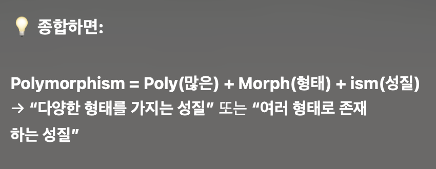 polymorphism 은 poly + morph + ism 의 합성어로, poly 는 '다수의' 라는 의미를 갖고 있고, morph 는 '모양' 을 가리킨다.