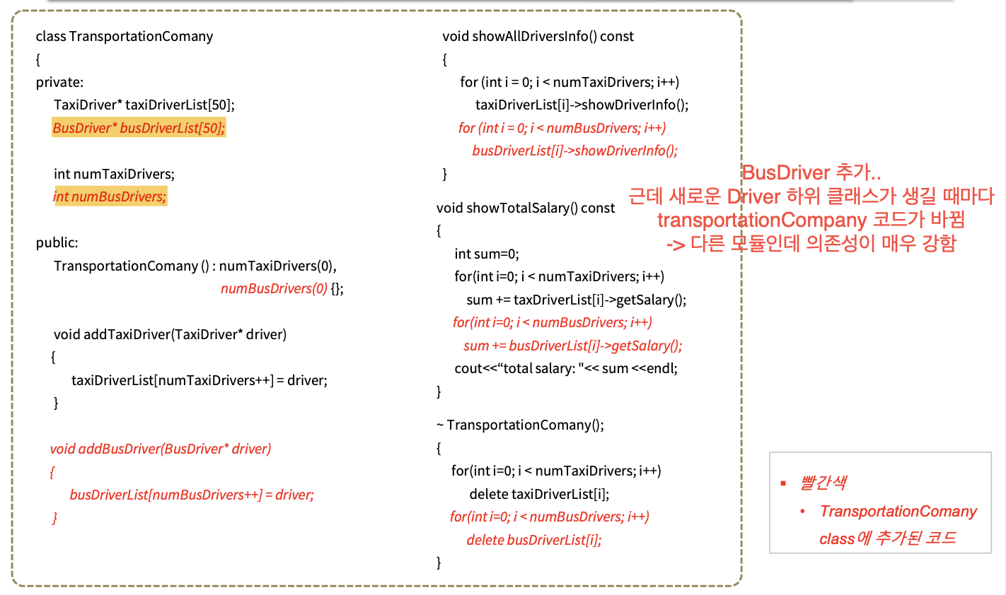 뿐만 아니라 Transportation Company 에는 TaxiDriver, BusDriver 를 추가할 수 있다는 정보를 알고 있어야 이 코드를 작성하고 유지보수 할 수 있다.