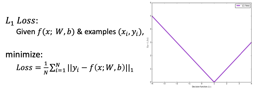 L1 Loss 는 각 성분 차이의 절댓값을 모두 더한 것이고, loss function 은 오른쪽 그림과 같은 형태의 그래프를 그린다.