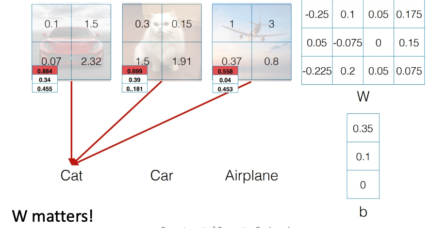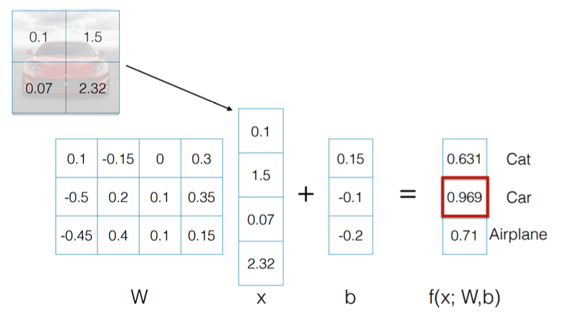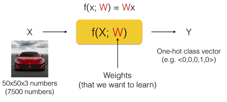 이 모델을 parametric approach 를 사용하여 학습시킬 때, 이렇게 함수의 형태를 선형 함수인 Wx 로 정의하고 W 를 찾는 문제로 바꾸어 풀 수 있다. 이렇게 선형함수를 사용하여 이미지를 분류하는 것을 Linear Classification 이라고 한다.