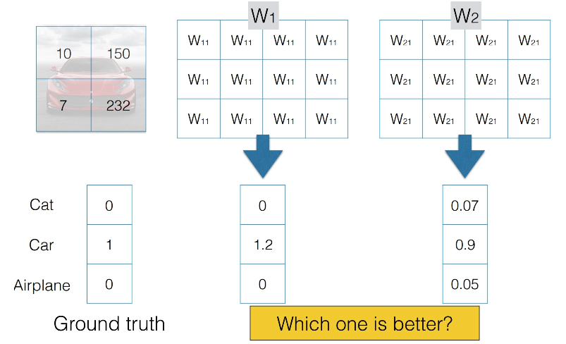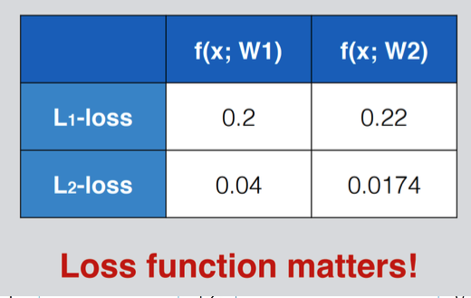 그런 상황에서는 Loss 함수를 어떤 것을 사용하는지에 따라 W1, W2 중 어떤 것이 더 좋은 지 선택이 갈릴 수 있다.