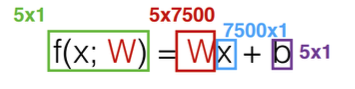 이때 7500 x 1 크기의 데이터가 들어왔을 때 출력으로 5 x 1 크기의 데이터로 나와야 하므로, 변환행렬 W 의 크기는 5 x 7500 이다.