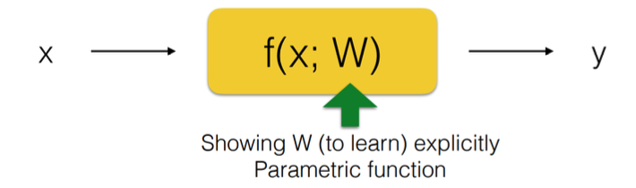 위 그림을 보면 함수를 f(X; W) 로 표현하였는데, X 는 입력으로 주어지는 데이터이고, W 는 학습시킬 파라미터를 가리킨다.