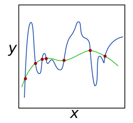 이렇게 데이터의 복잡도에 비해 모델의 복잡도가 너무 높으면 (다항식으로 치면 차수가 너무 높은 경우) 위 오른쪽 그래프와 같이 Overfitting (과적합) 문제가 발생할 수 있다.