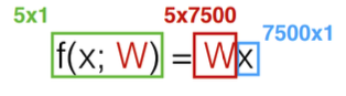 이때 7500 x 1 크기의 데이터가 들어왔을 때 출력으로 5 x 1 크기의 데이터로 나와야 하므로, 변환행렬 W 의 크기는 5 x 7500 이다.