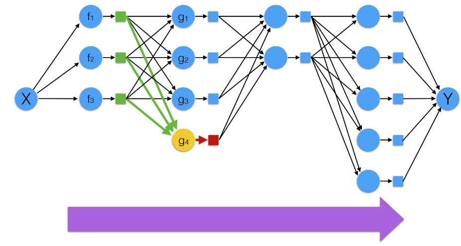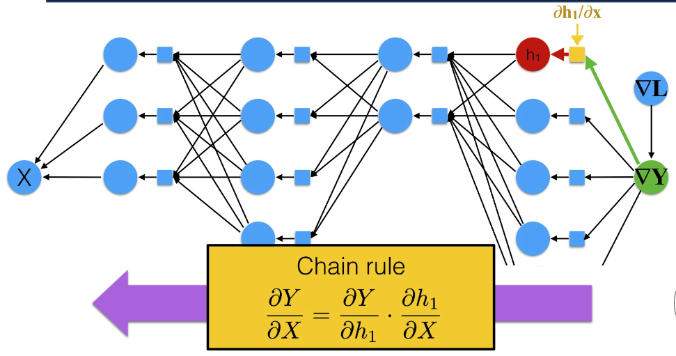 그리고 Y 에서부터 X를 향해 가면서 체인 룰에 따라 미분 값을 구하면서 업데이트 하므로, 그 중간 중간에 미분값을 구해서 레이어에 저장해뒀다가 이전 레이어의 미분값을 계산할 때 연쇄적으로 적용한다.