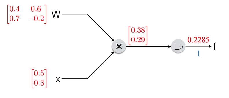 이 0.2285 라는 값이 최종적으로 구한 Loss 라고 할 때, 역전파 기법으로 기존 W, x 파라미터를 업데이트 해보자.