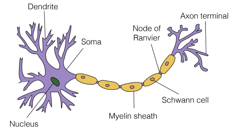 뉴런은 핵에서 전기 신호를 받아 저장하고 있다가 액손으로 전달하며, 마일린이 액손을 감싸 보호하고 있다.
