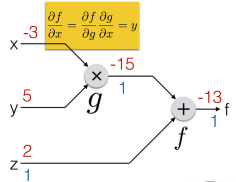 그래서 위 그림과 같이 로스를 x로 미분한 값을 구할 땐 앞서 구해둔 '로스를 g로 미분한 값'을 현재 레이어에서 보고 있는 'g를 x로 미분한 값'에 곱하여 구한다.