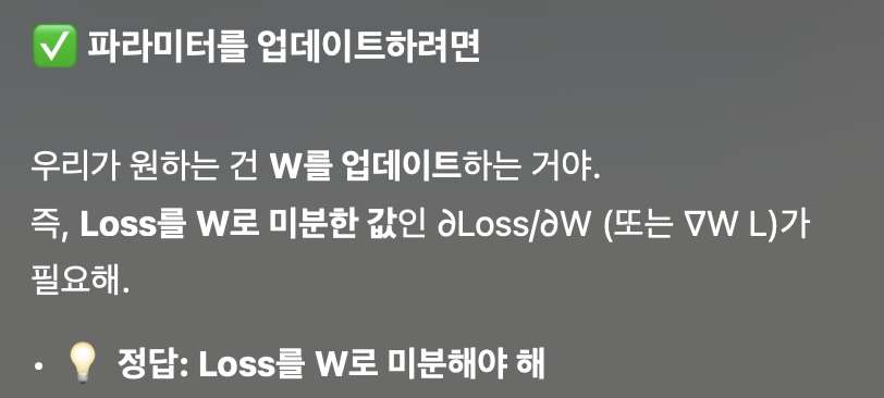 나머지 W 는 학습의 대상이므로 미분값을 기반으로 경사하강법을 적용해서 업데이트를 해주면 된다.