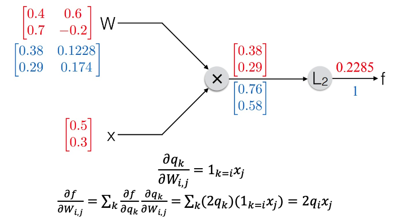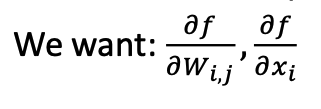 따라서 우리가 찾을 값은 W의 i, j 번째 원소별 미분값, x 의 i 번째 원소별 미분값이다.
