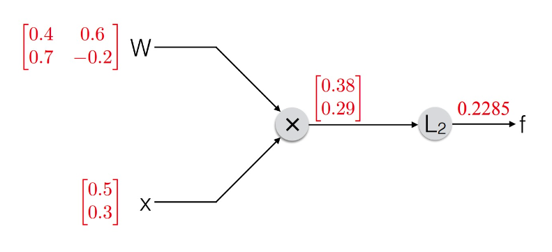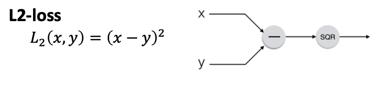 L2-Loss 의 computational graph 는 그림과 같이 x - y 연산을 먼저 하고 -> 제곱(square) 하는 과정으로 표현한다.