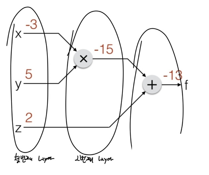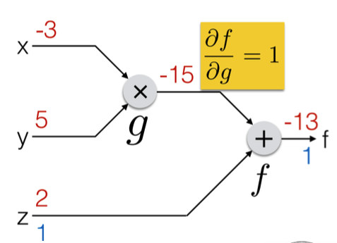 그리고 f 는 Loss 처럼 생각하기로 했으므로 이 값들을 조합하면 Loss 함수 f 에 대한 x, y, z 의 미분값을 얻을 수 있다.