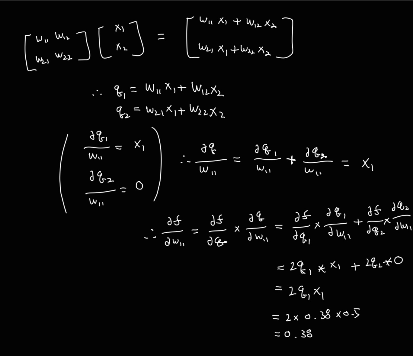 그래서 f 를 w11 으로 미분한 값은 0.38 이 나온다.
