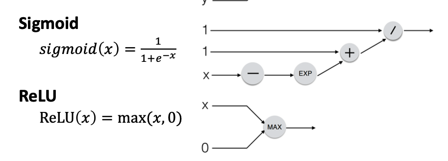 뒤에서 다룰 activation 함수로 쓰이는 시그모이드와 렐루의 computational graph 는 그림과 같다.