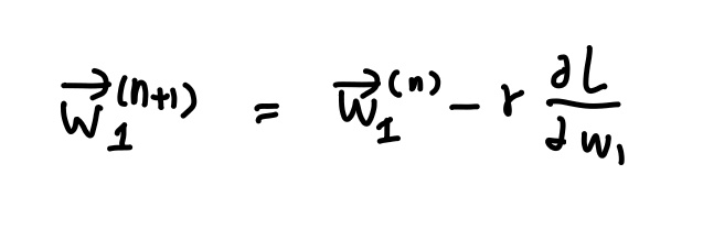 경사하강법 아이디어와 동일하게 현재 n번째 w1 벡터에서 Loss 함수를 w1 으로 미분한 방향의 반대방향으로 learning rate 를 곱해준 만큼 이동하여 n+1 번째 w1 벡터를 만든다.