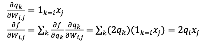 qk 를 Wij 로 미분한 것은 q 를 구성하는 각각의 원소를 Wij 로 미분한 것과 같다.