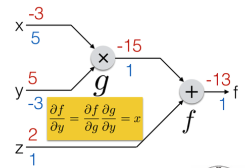 g를 x로 미분한 값은 y 였고, f를 g로 미분한 값은 1이므로, 최종적으로 f 를 x로 미분한 값은 y 가 되어 y 값 5가 그 다음 x의 값이 된다.