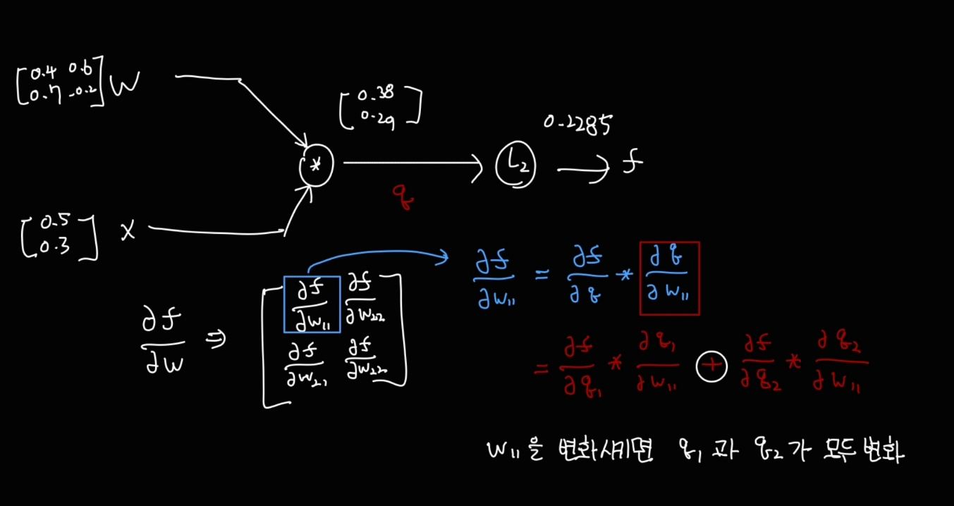 따라서 우리가 찾을 값은 W의 i, j 번째 원소별 미분값, x 의 i 번째 원소별 미분값이다.