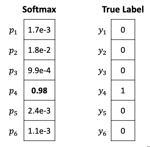 이렇게 softmax 결과값과 True lable 이 있을 때, 위 공식에 이 값들을 넣어 loss 를 구해보면