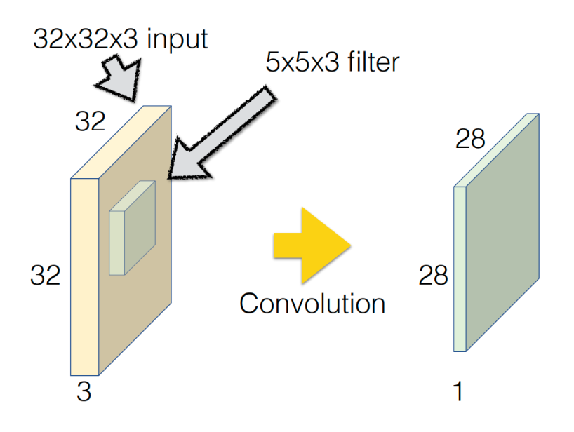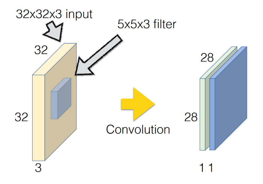 만약 이미지의 크기가 32 x 32 x 3 이고, 필터의 크기가 5 x 5 x 3 이라고 해보자.