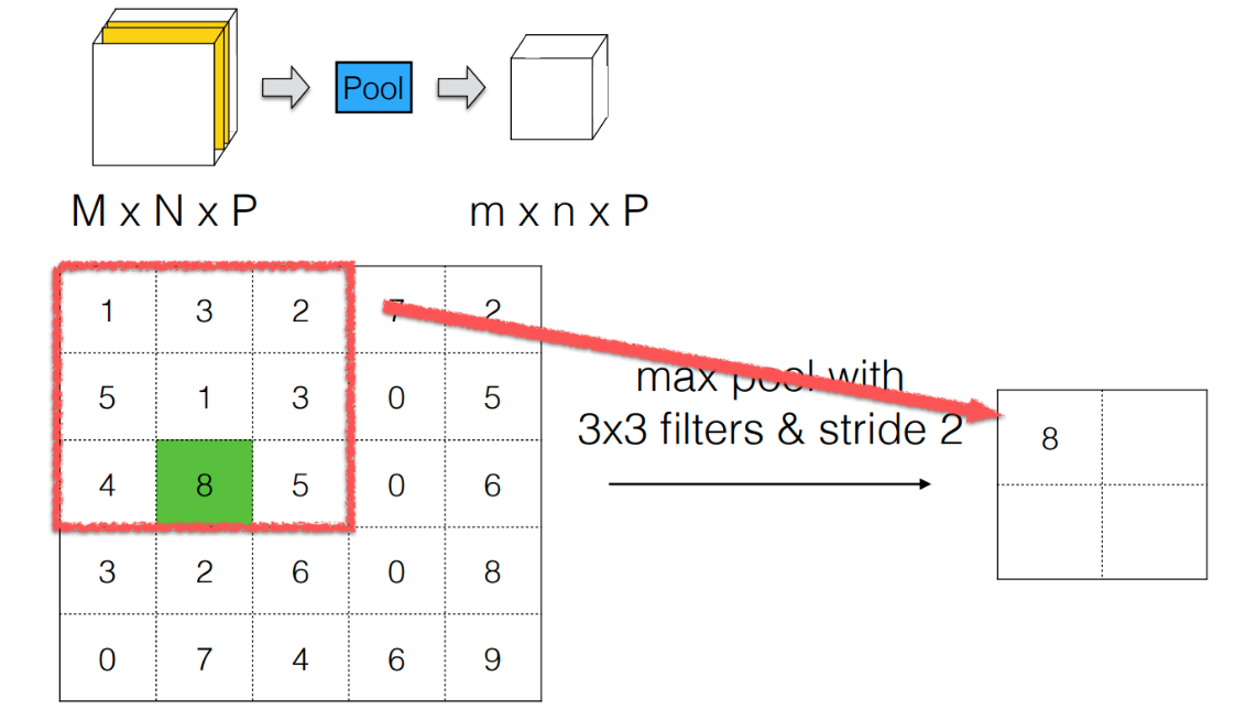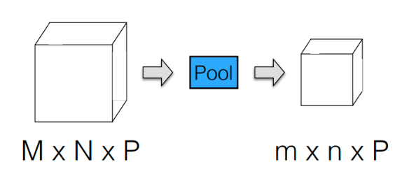 그래서 이렇게 M x N x P 크기의 데이터가 주어졌을 때 pooling layer 를 거치면 m x n x P 크기가 된다.