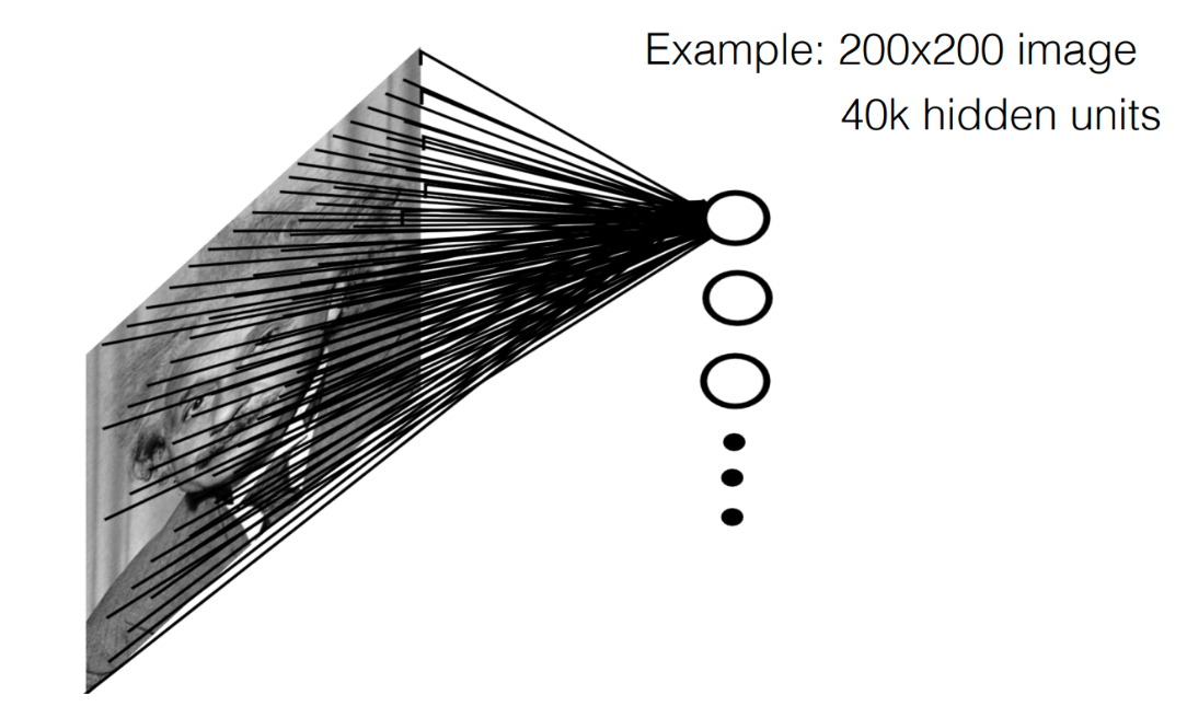 그러면 이미지 입력 크기의 상관없이 출력이 4만이라면 4만개 출력 각각이 10x10 = 100 개 픽셀과 연결되므로 400만개의 파라미터를 학습시키면 된다.