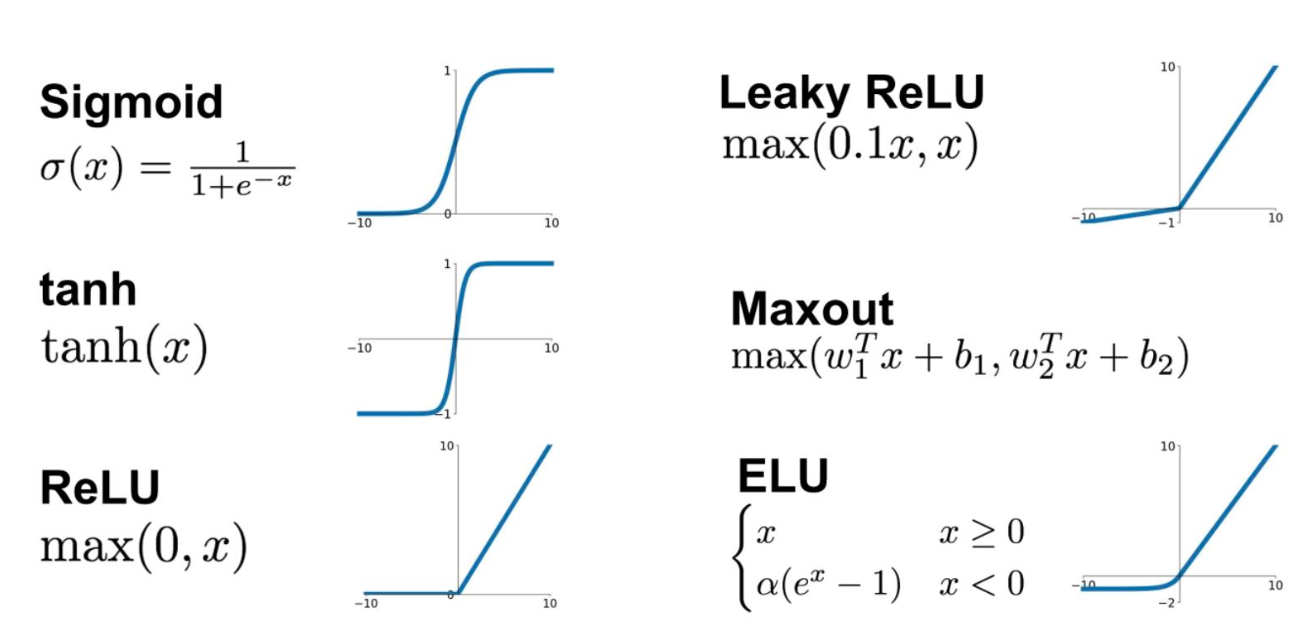 처음에는 시그모이드 함수를 자주 사용했는데, 시그모이드 함수의 경우, 미분값이 0에 가까운 범위가 너무 많아서 역전파 연산시 방해가 되기 때문에 (vanishing gradient problem) 요즘은 ReLU 또는 Leaky ReLU 를 많이 사용한다고 한다.