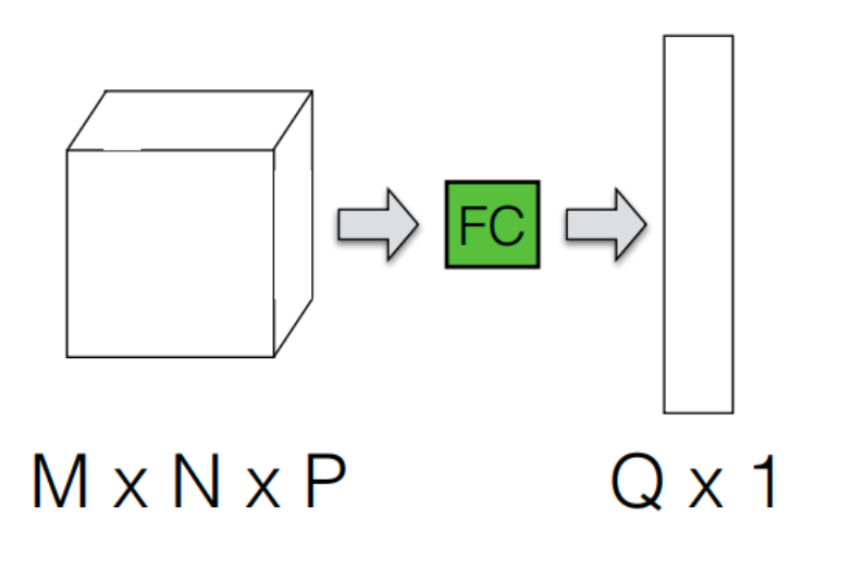 예를 들어 M x N 크기의 채널 (RGB 같은 것)이 P인 이미지가 FC 레이어를 통과하면 행렬을 쭉 펼쳐서 (M x N x P) x 1 크기의 벡터로 변환한다. 그리고 그 앞에 Q x (M x N x P) 크기의 행렬 W를 곱해서 Q x 1 크기의 벡터로 바꿔준다.