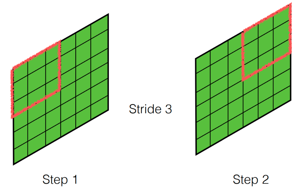 이 간격을 stride 라고 부르며, stride = 3 인 경우엔 3칸씩 건너 뛰면서 쓸고 지나간다.