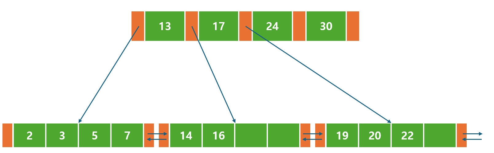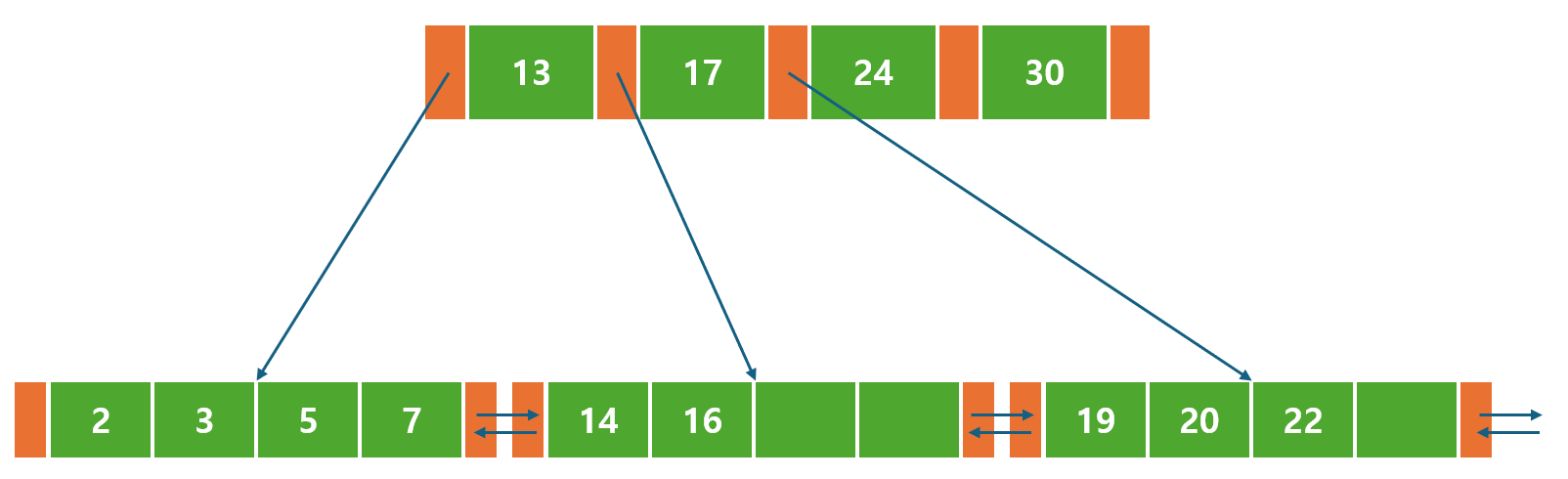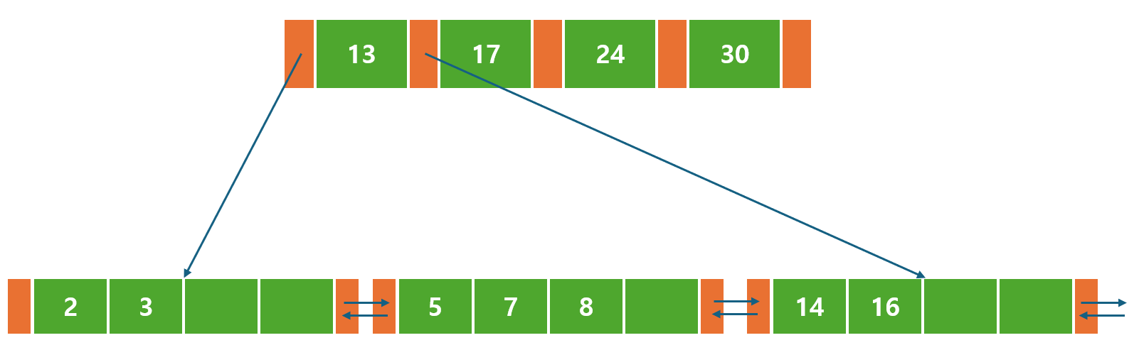 오른쪽 비단말 노드에는 <24, 30> 이라는 값 2개와 포인터 3개가 존재한다.