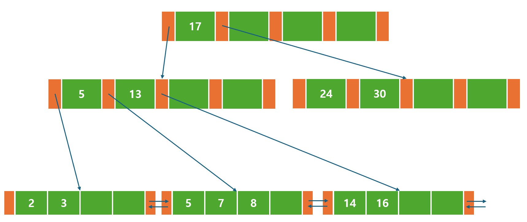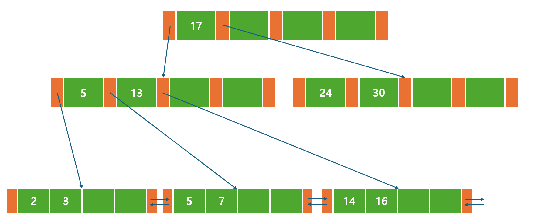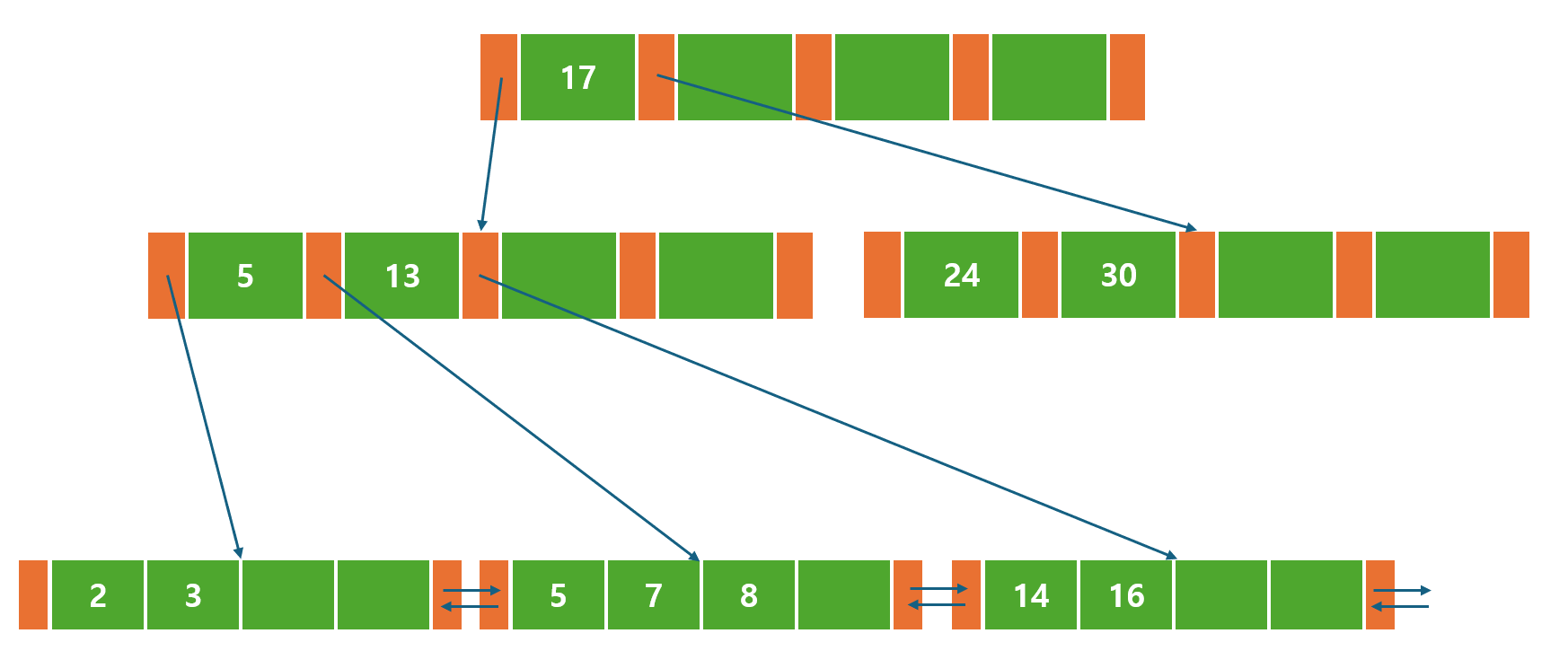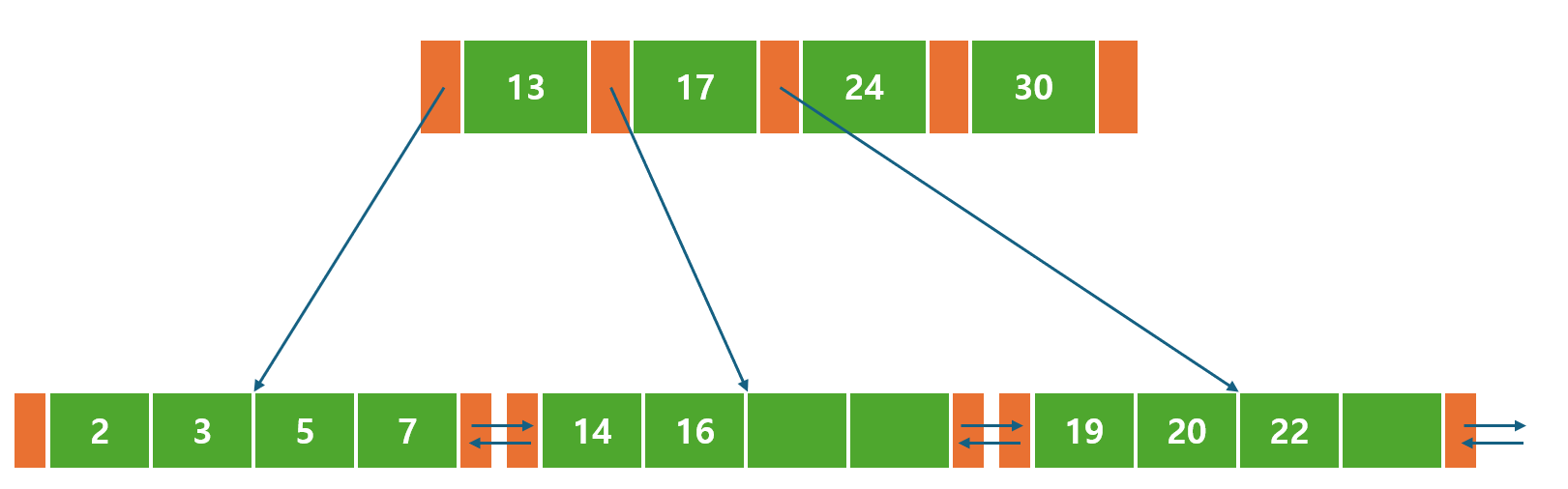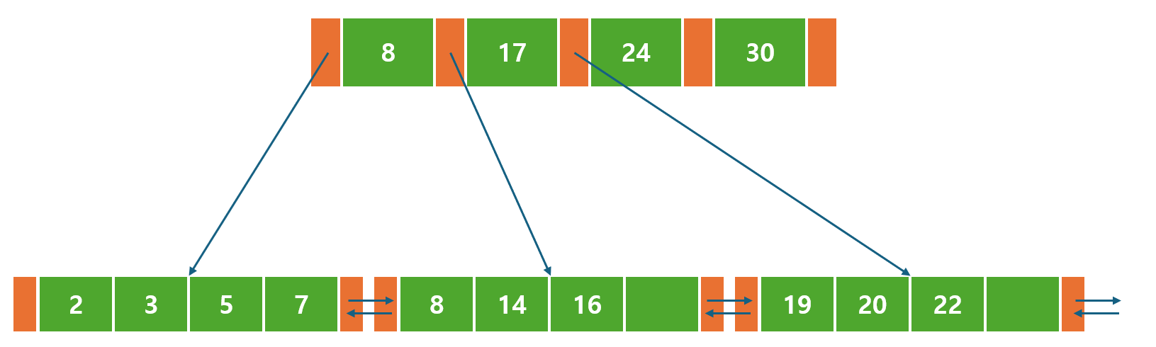 어떤 B-Tree 변형 버전에서는 부모 노드에 대한 포인터에 더해 형제 노드와 연결되는 포인터를 갖고 있기도 하다.