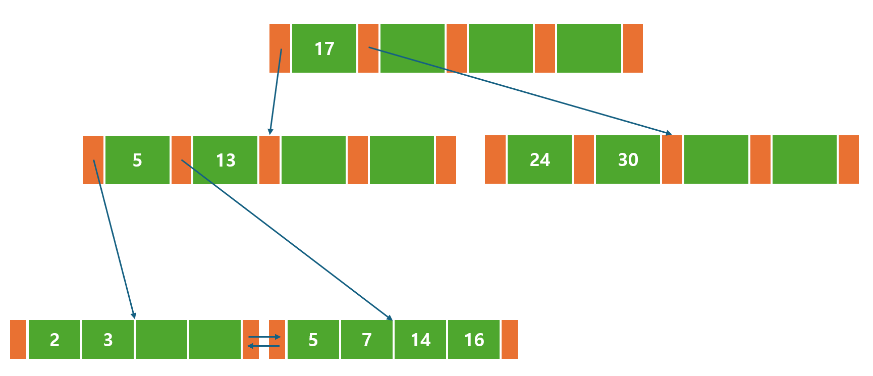 즉, i 번째 포인터가 가리키는 트리에 저장된 모든 값 v는 i-1 번째 키 값 ≤ v < i 번째 키 값 을 만족한다.