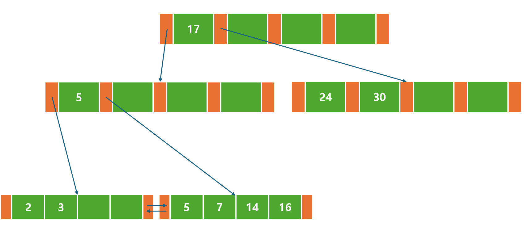 만약 범위 스캔을 처리하고 있었다면 5라는 범위의 경계값에서 제일 가까운 값을 찾은 뒤, 형제 노드 포인터를 따라 범위 끝에 도달할 때까지 값을 순차적으로 읽으면 된다.