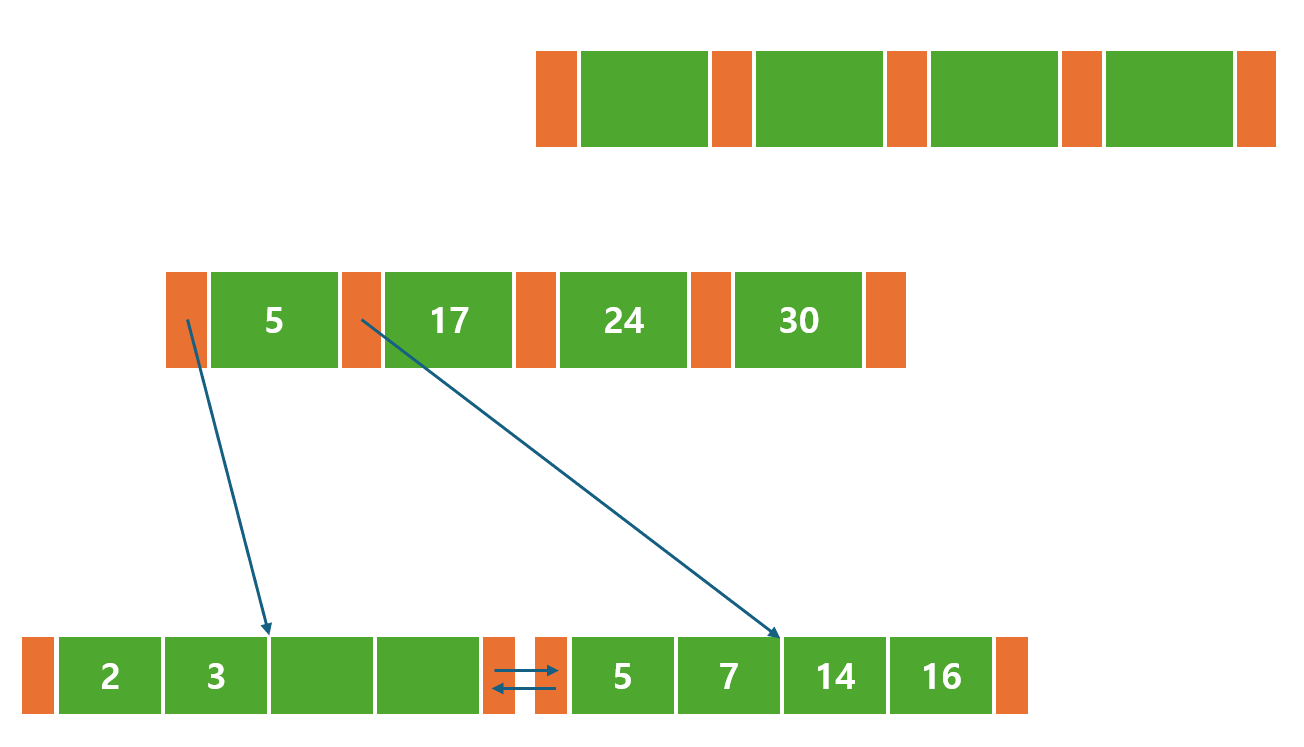 이 경우, 대부분 리프노드에서 형제 노드에 대한 포인터를 갖고 있어, 범위 스캔을 효율적으로 수행할 수 있다.