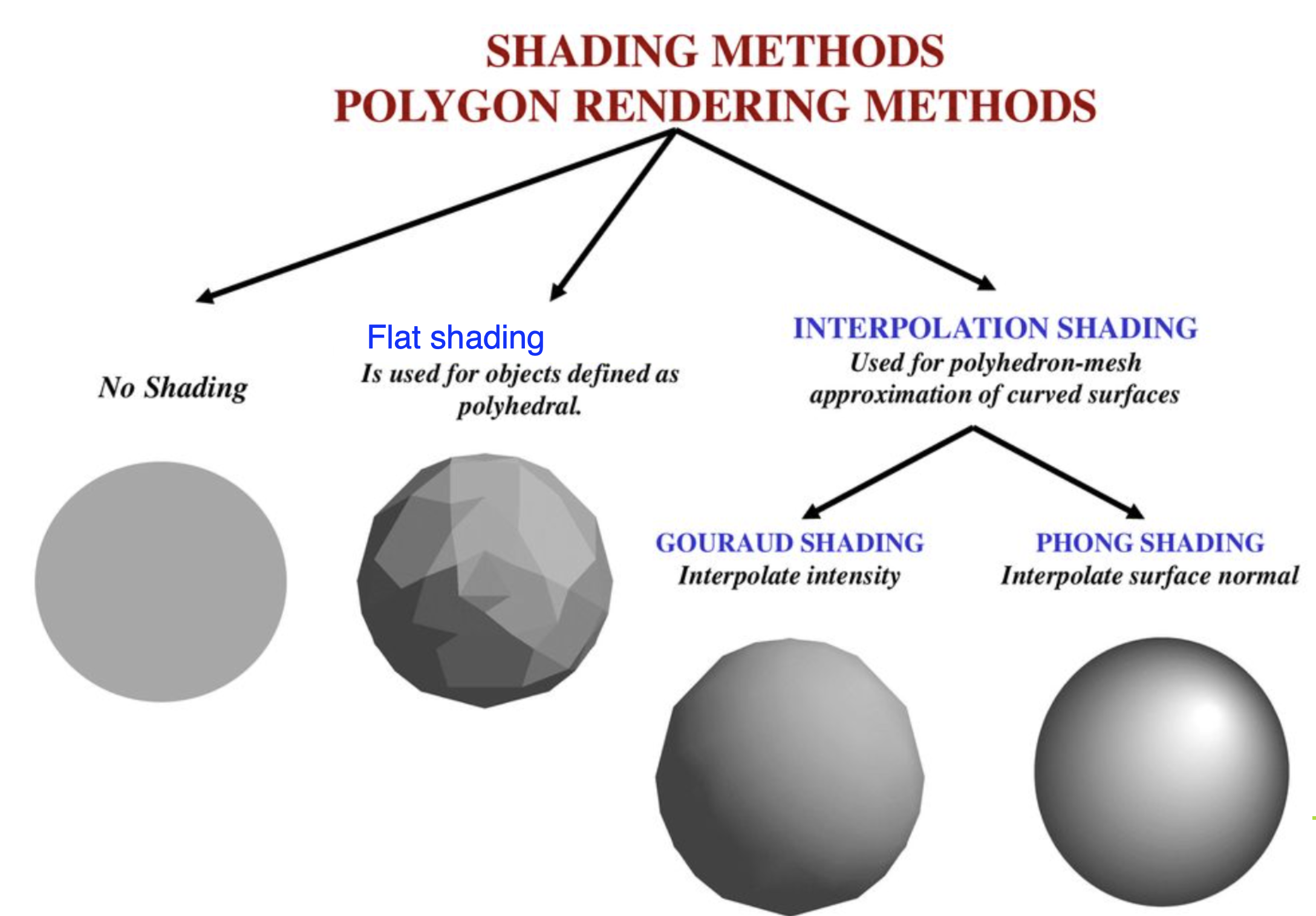 그리고 구체적인 방법에 따라 크게 Flat Shading, Gouraud Shading, Phong Shading 이 있다.