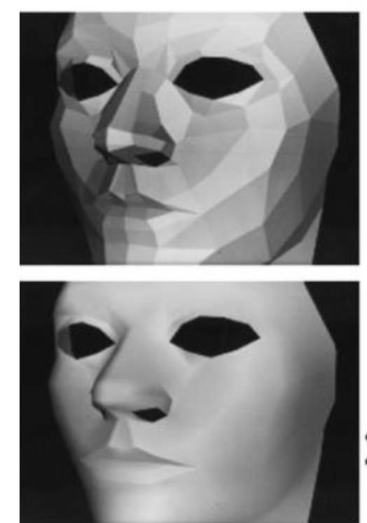 gouraud shading 방법을 사용하면 실제로는 폴리곤으로 이루어진 모델도 곡면인 것처럼 보이게 된다.