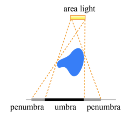 광원이 점광원이 아니라 area, 또는 volumn 형태일 때 그림자를 가리켜 soft shadow 라고 한다.