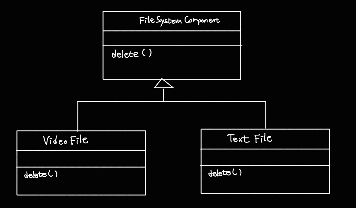 이제 우리가 원하는 것은 VideoFile 하나든, TextFile 하나든, 이 두가지 타입을 뒤죽박죽 섞어서 가지고 있는 Directory 든 모두 같은 delete() 인터페이스를 정의해서 하나의 인터페이스로 다루고자 한다.