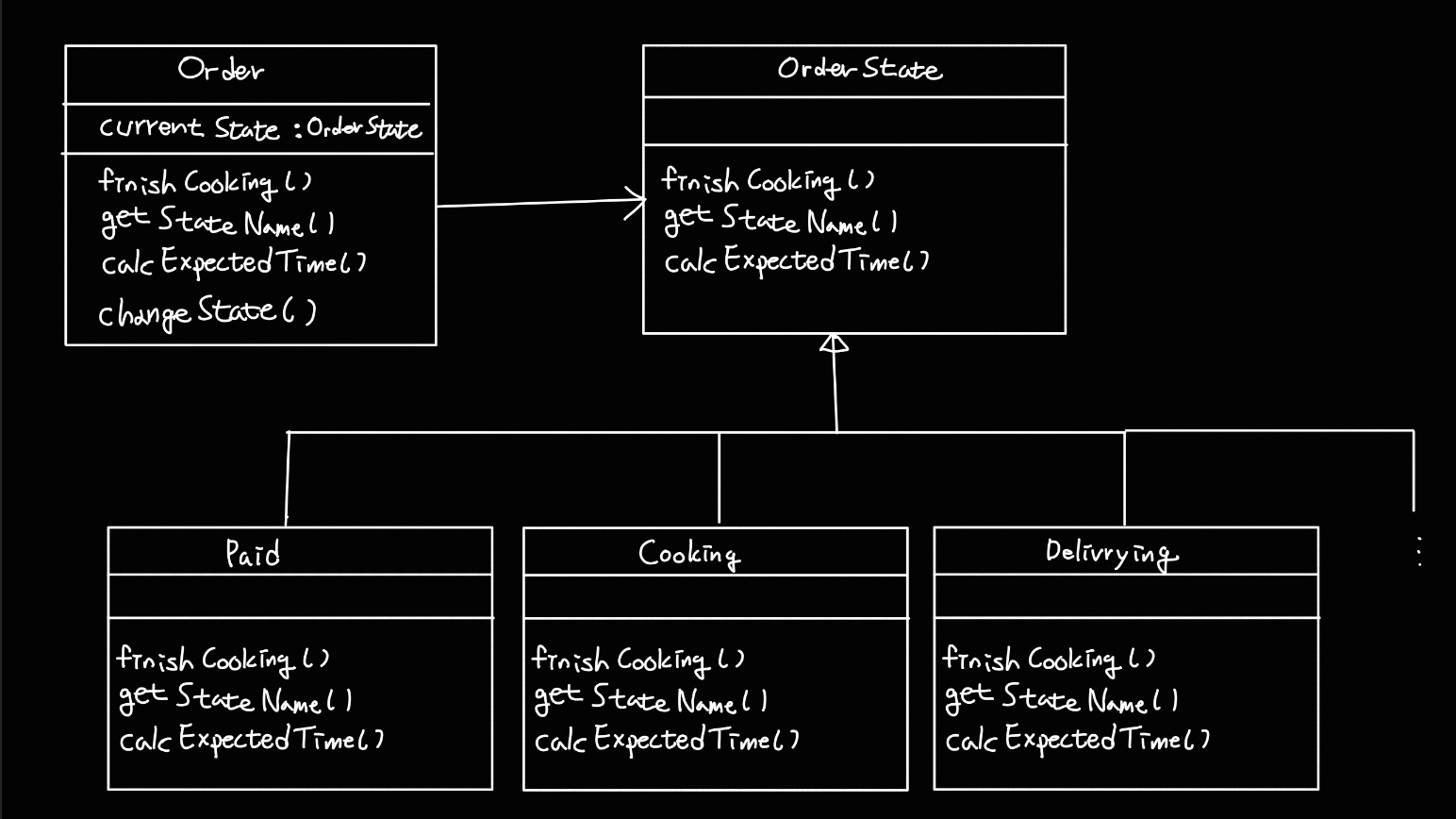 finishCooking(), getStateName(), calcExpectedTime() 메서드는 4가지 상태에 따라 다르게 구현되는 메서드이다.